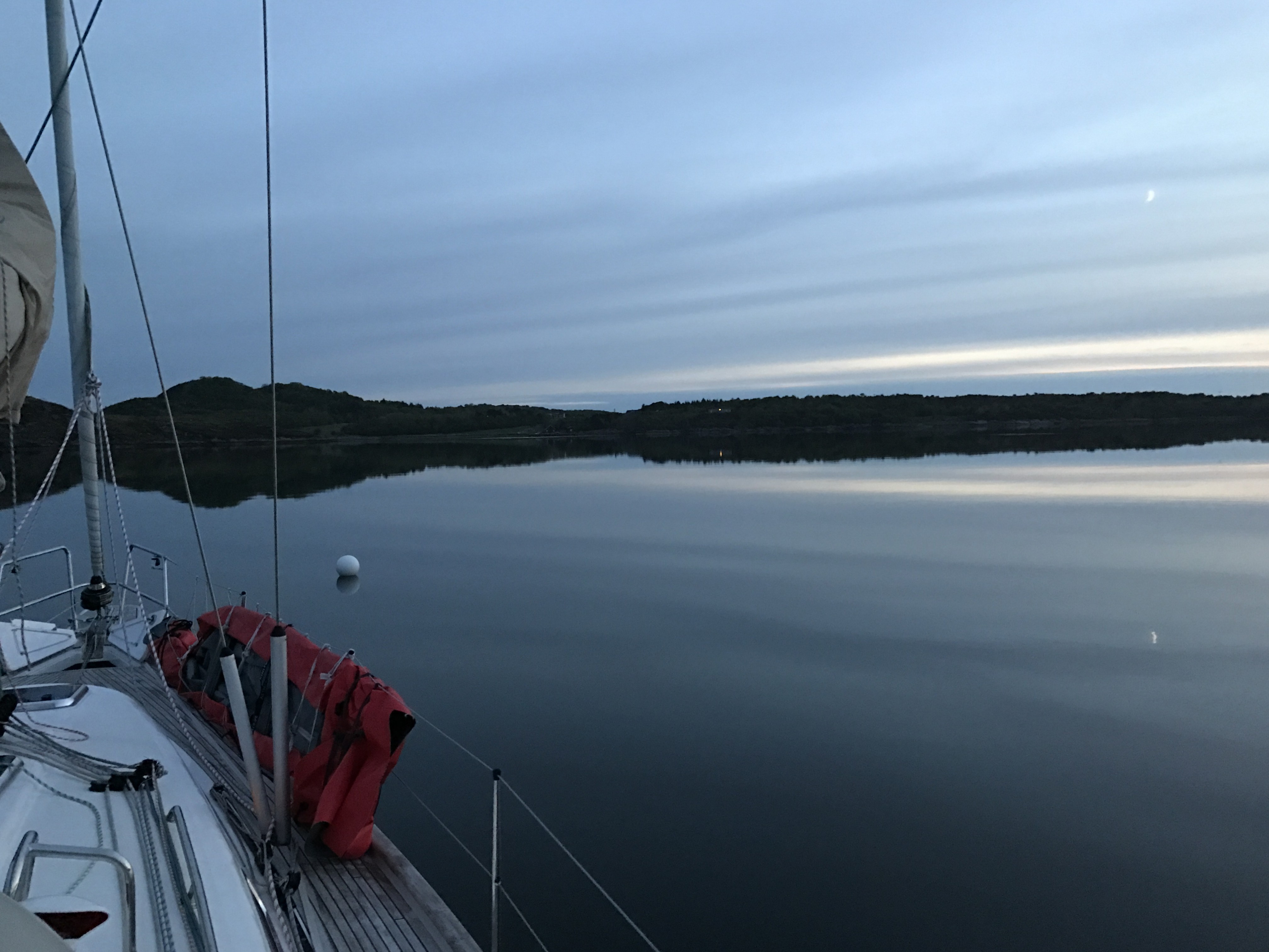 Framme i Sirivåg kl 22, enda lediga platsen var utanpå en annan segelbåt men de sov så ingen kom upp. Jag lyckades knyta midskeppsknapen och la sen ut förtöjning med båtshaken i för och akter så jag slapp kliva över på deras båt. Hoppas de inte ska gå kl 06… Fin lyrtorsk kokad på Ulfs goda sås som han gjorde till torsk i ugn med tomater 🙂 Tack Ulf!