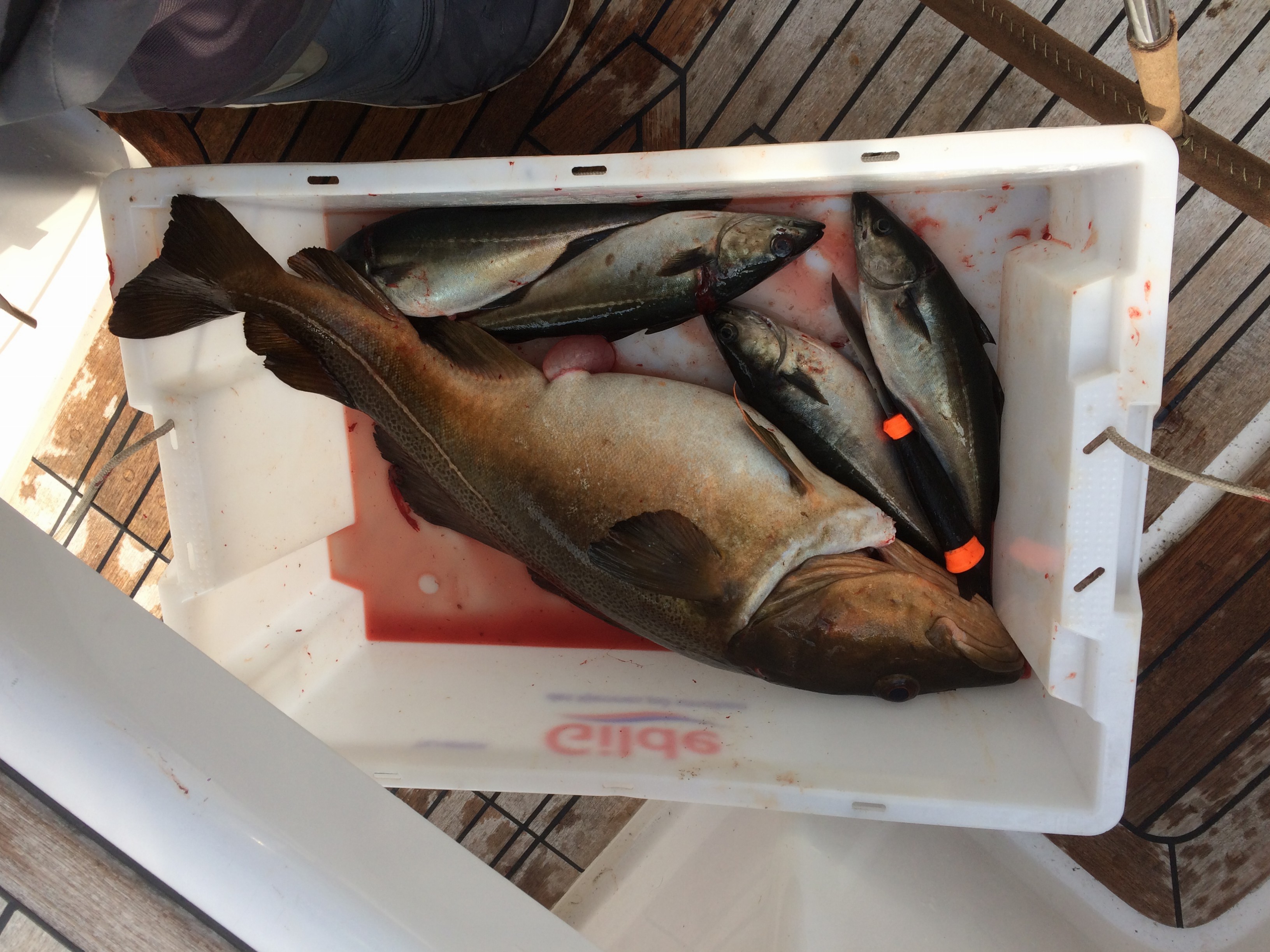 Fyllde på vatten och diesel i Hjellestad, sen påbörjade jag färden mot Skärhamn. Vindstilla och motor, lite duggregn. På en fjärd låg 3 små motorbåtar och fiskade, en helt oemotståndlig syn! Men de låg inte på någon brant utan bit ut på ett flak på 50-100 m djup. Jag började på 80 m och fick strax en sej och en lyrtorsk på samma krok. Nu syntes lyrtorskens rejäla underbett tydligt. Den var också lite brunare i färgen. Efter en stund fick jag en 🙂 Kände sen att nu finns det inte plats för mer fisk ombord!