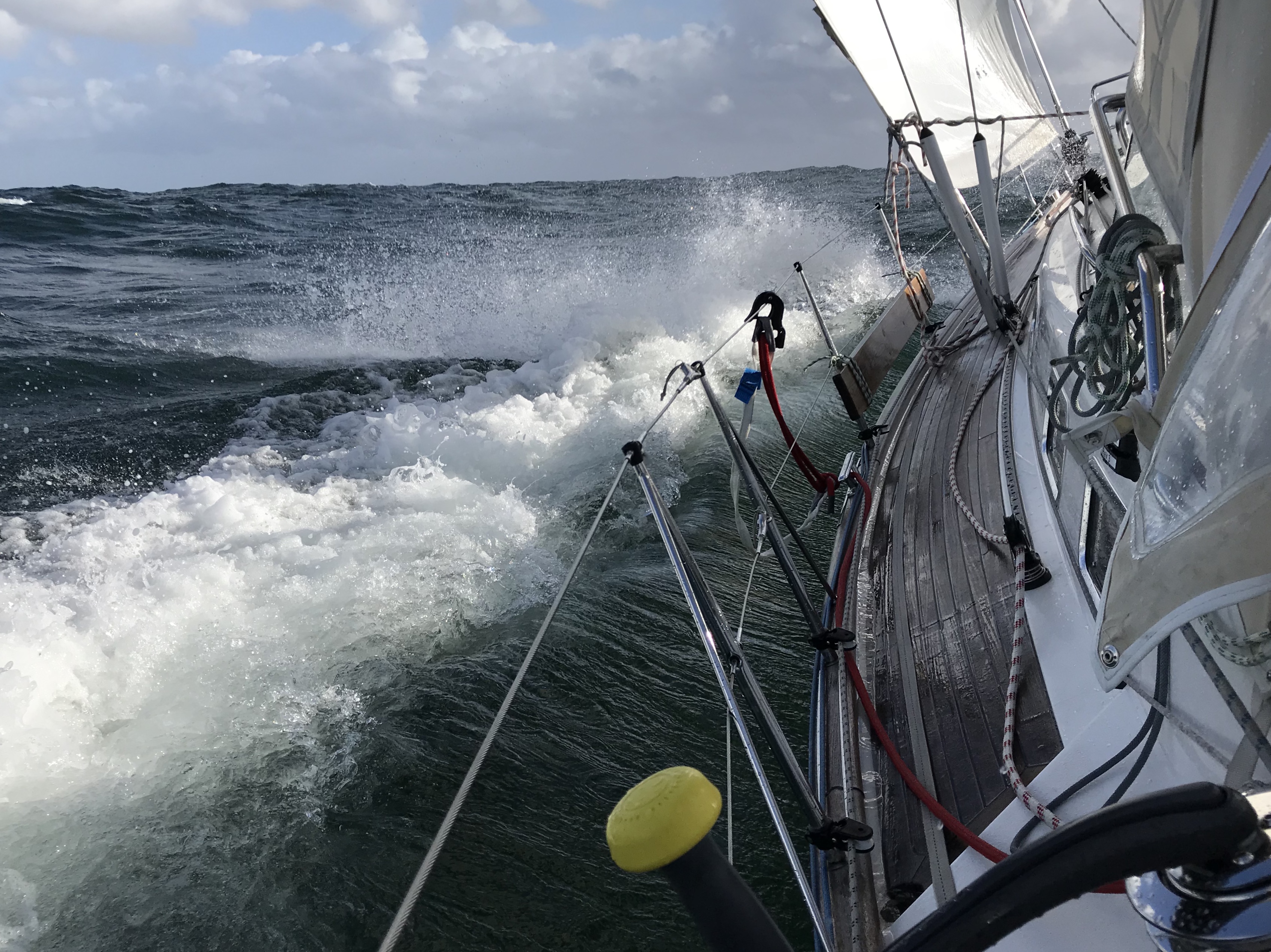 Området är beryktat för stora vågor eftersom havsbotten grundar upp till 20-40m långt ute till havs. Det stämde bra, kulingen hade blåst upp de största vågor jag seglat i även om det nu blåste 8-9 m/s mest. 4 meter uppskattade jag de stora till som rullade kors och tvärs men Valborg flöt upp som en kork 🙂 En mötande segelbåt försvann till 2/3 i vågdalarna. Med 15 m mast skulle det betyda 10 m mellan högsta vågtopparna och dalarna!? Även ett stort lastfartyg försvann nästan helt i vågdalarana. Sakar mitt tele till systemkameran som jag glömde hemma 🙁