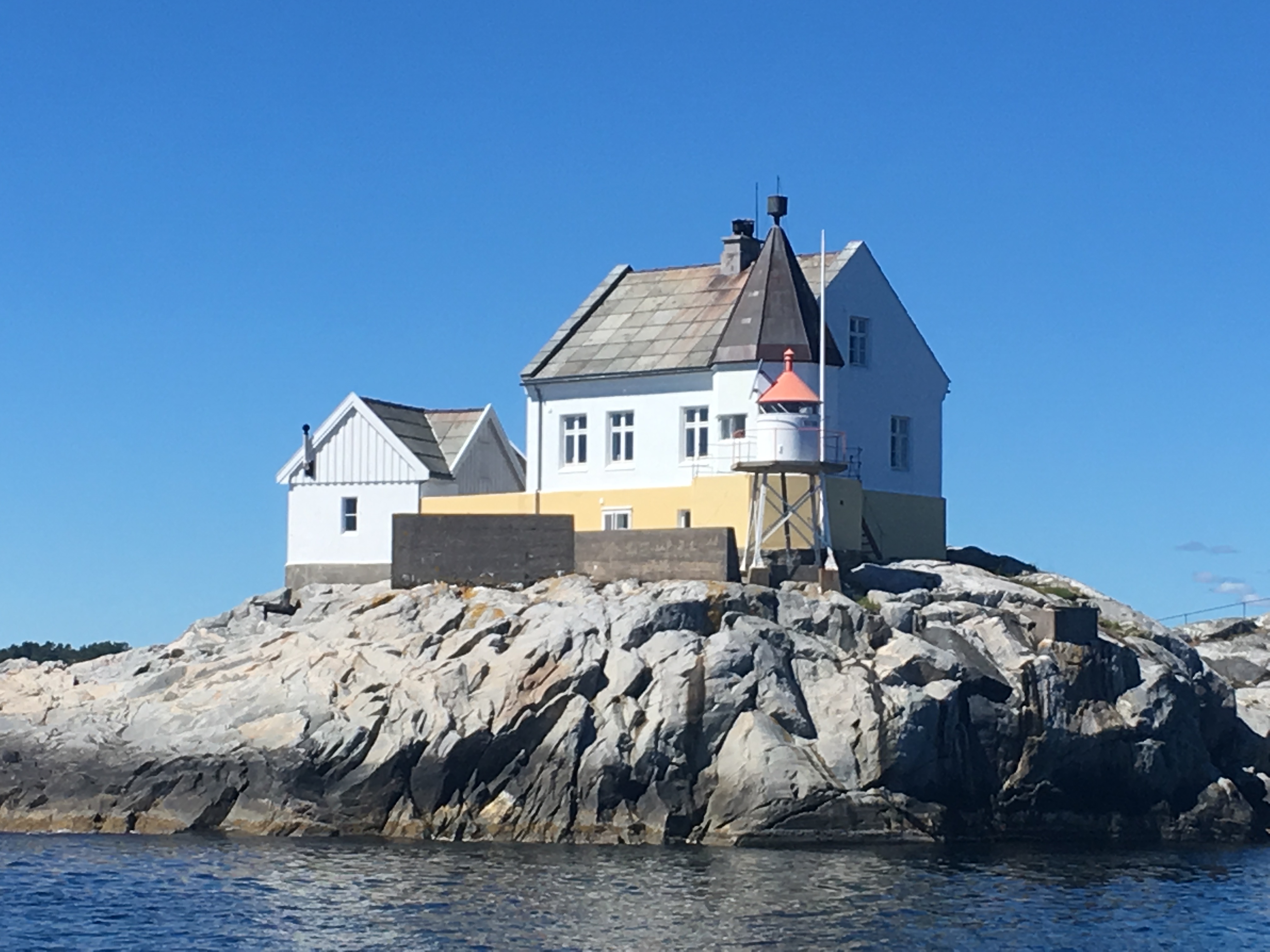 Långfrukost efter natt på svaj i lugn vik med spegelblankt vatten och morgonkonsert av tärnor och mås.. Lika lugnt idag, med gennaker och förlig vind som tog oss vidare österut mot Sverige. Vi hade tänkt söka natthamn på Svenner fyrö utanför Larvik men det var lite för blåsigt och trångt i viken bakom fyren och fyrhusen. Vi fick uppleva den kulturminnesförklarade fyren och de röda granitkipporna från Valborgs däck och konstaterade att hit kommer vi gärna och lägger till en annan gång med gynnsammare förhållanden.